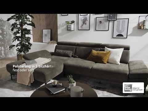 Unsere Eckkombination beinhaltet einen Longchair links mit integriertem klappbaren Armteil sowie ein zweisitziges Element mit Armlehne rechts und zwei Sitztiefenverstellungen.