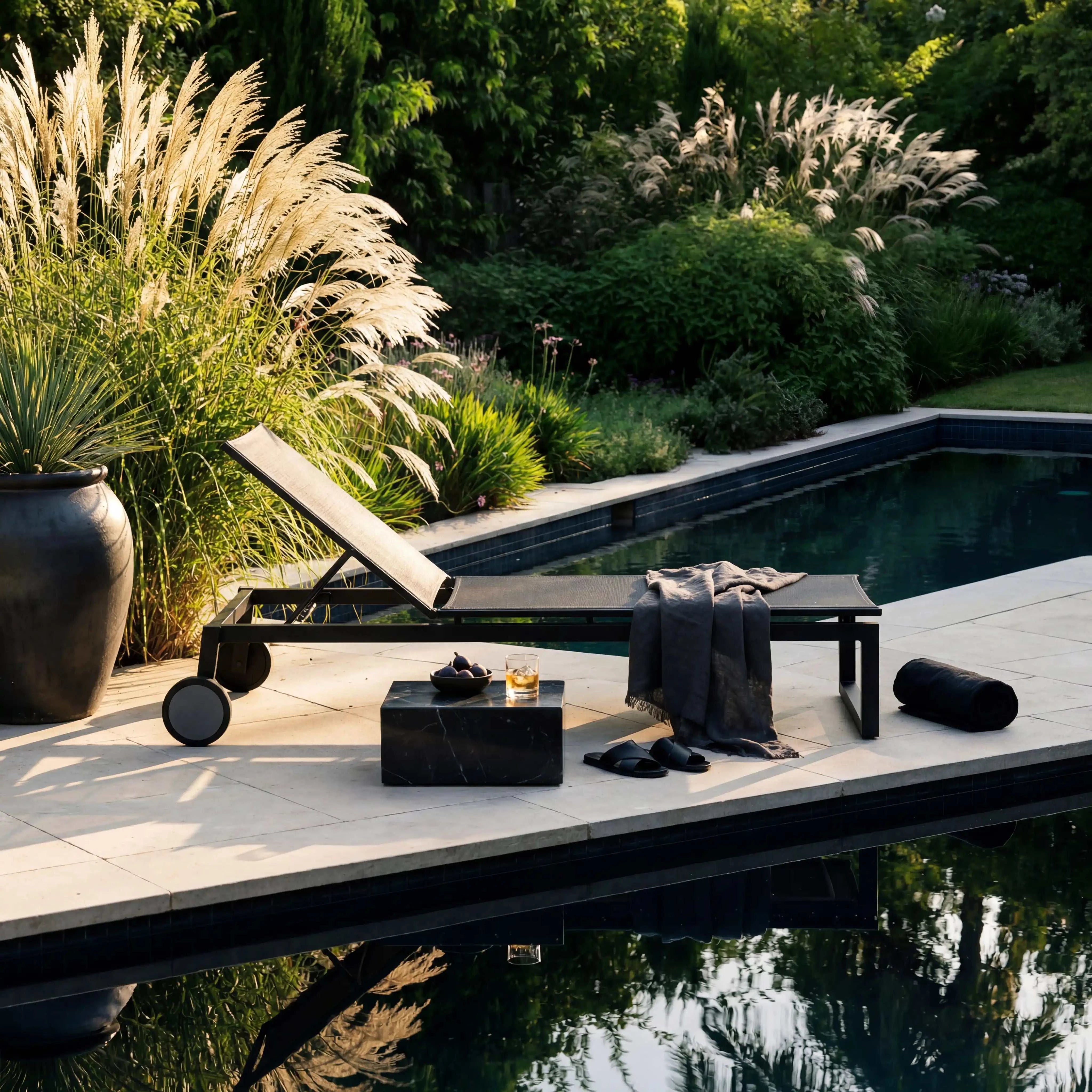 • Gartenliege Robin aus mattschwarzem Aluminium mit verstellbarer Liegefläche und Rollen