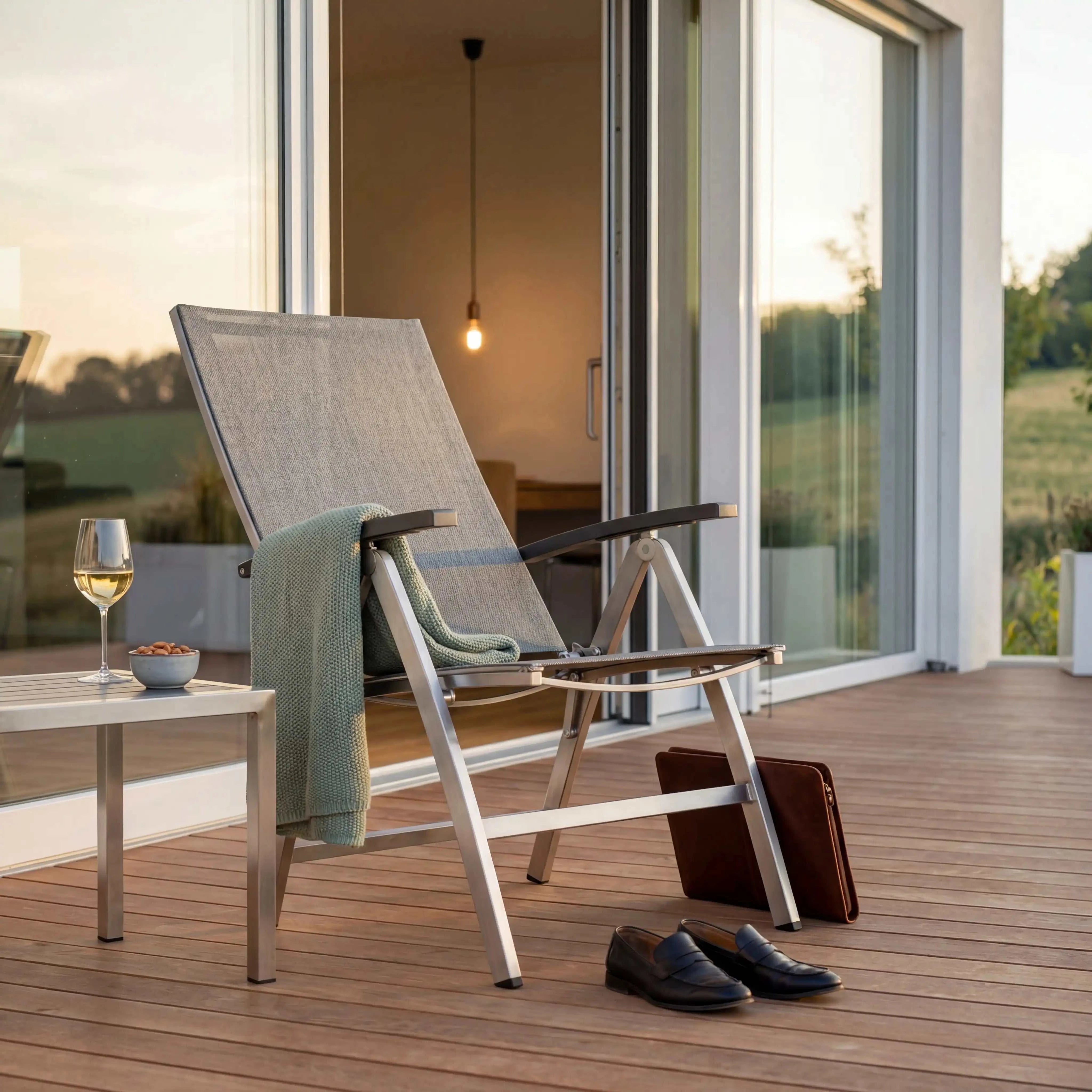 Der Klappsessel Mika ist eine hochwertige Lösung für alle, die Outdoor-Komfort mit maximaler Flexibilität verbinden wollen. Das Edelstahlgestell sorgt für eine stabile, wertige Basis, während die Textilen-Bespannung in Leinen Grau eine ruhige, zeitlose Optik und ein angenehmes Sitzgefühl liefert. Die Aluminiumarmlehnen in Anthrazit setzen einen modernen Akzent und runden das Design klar ab.