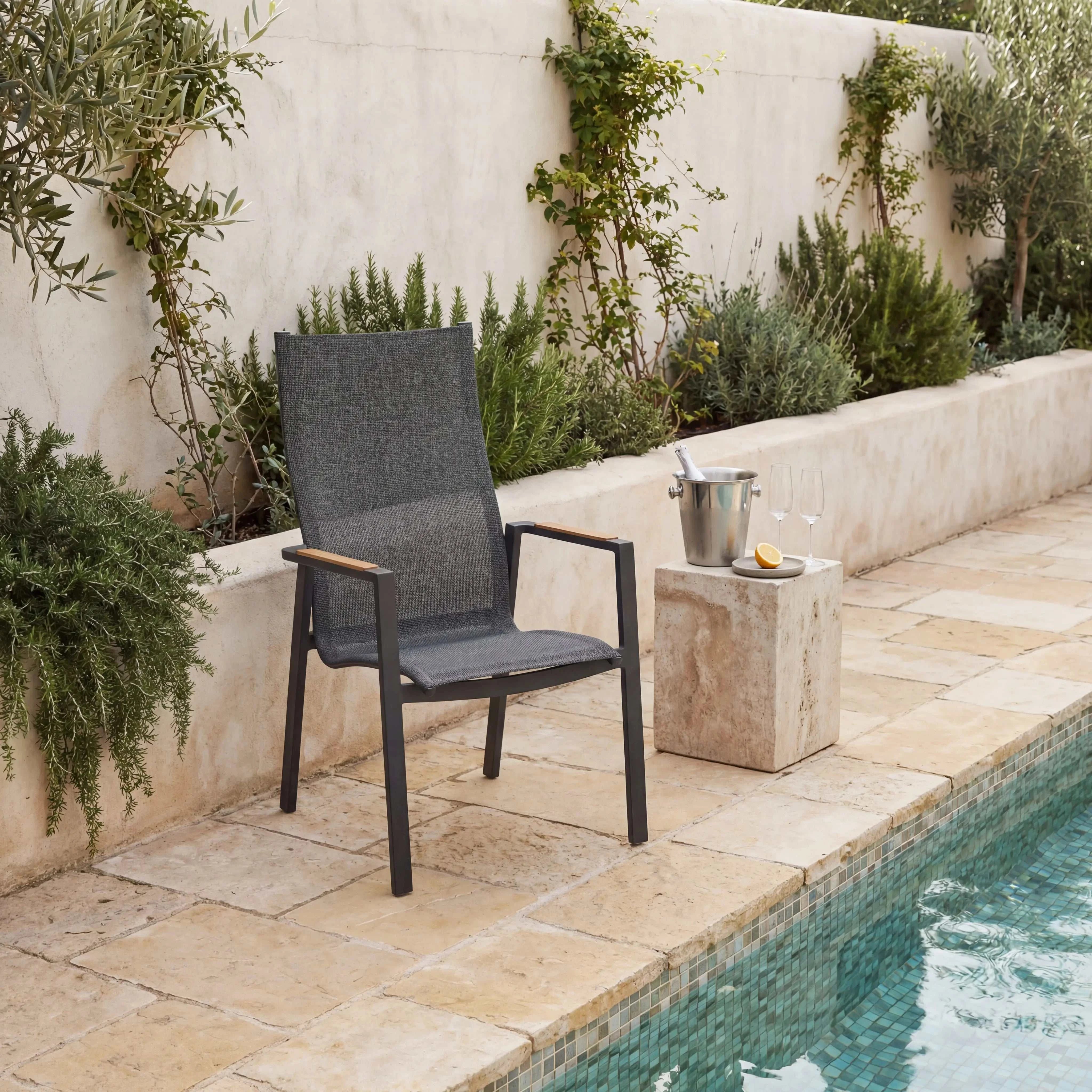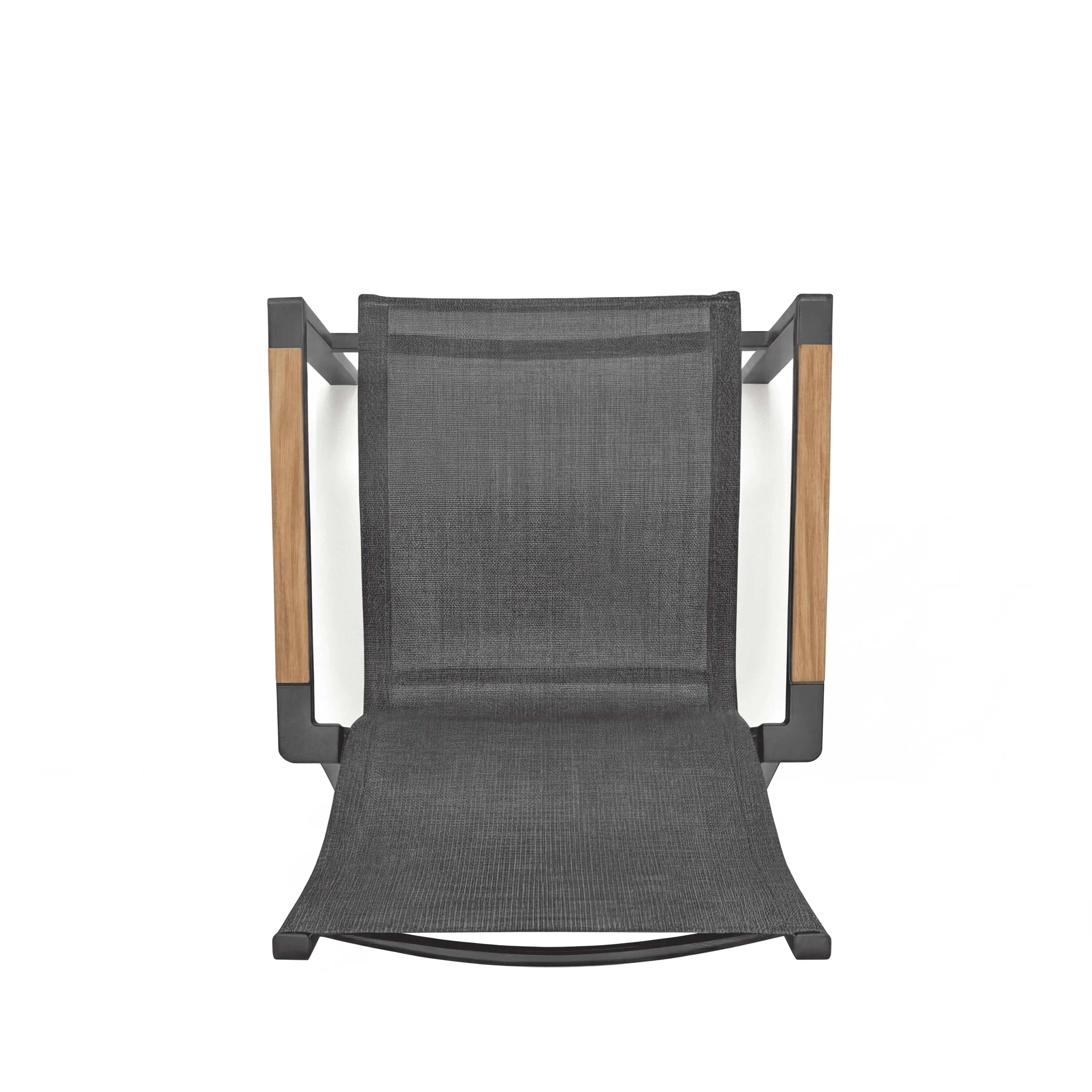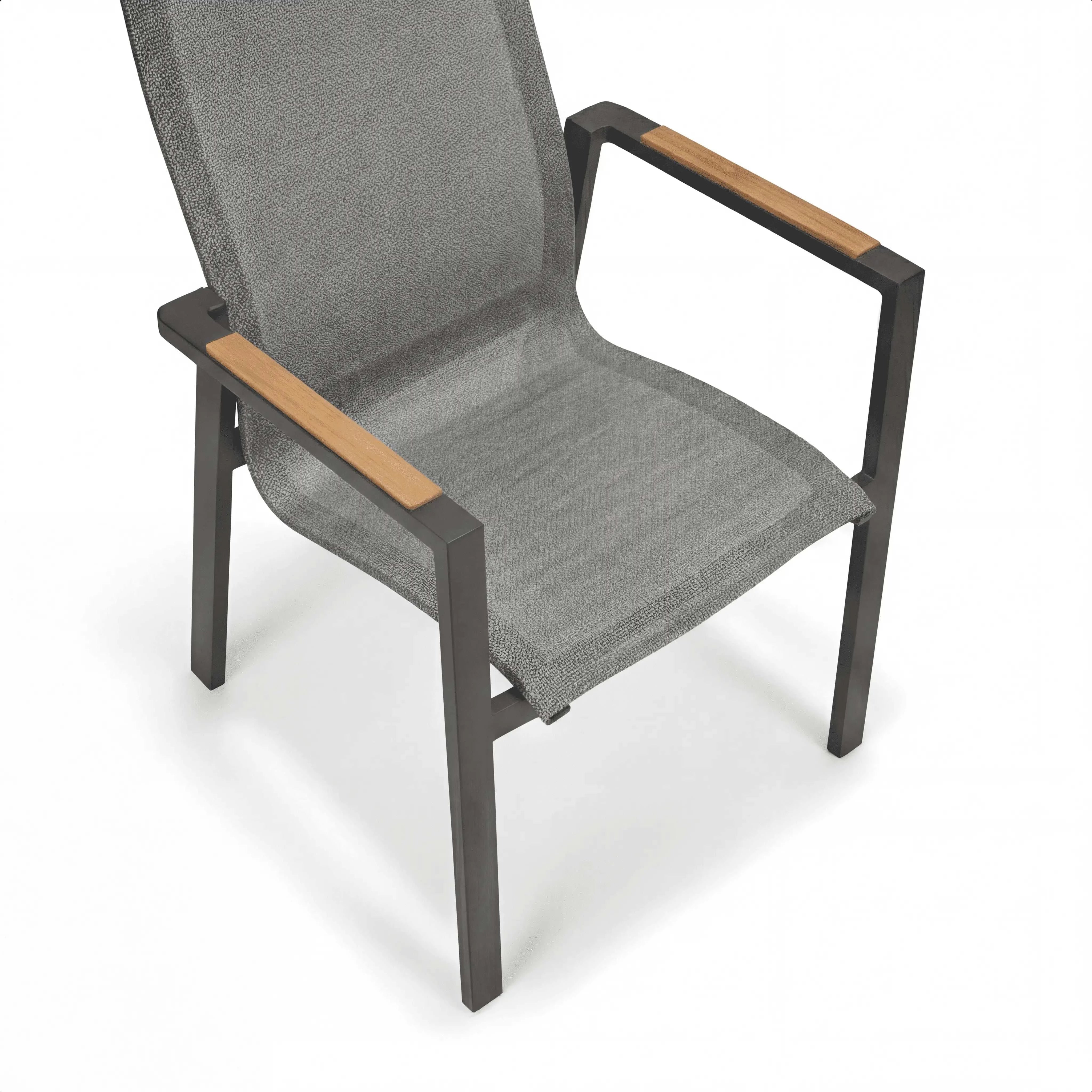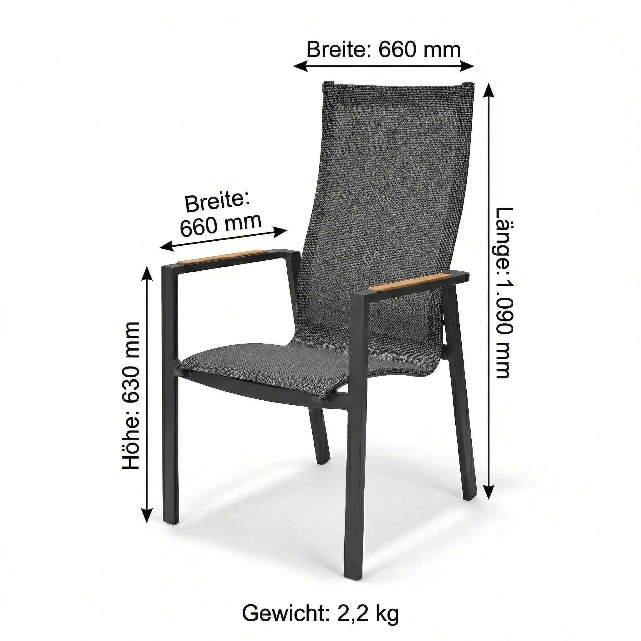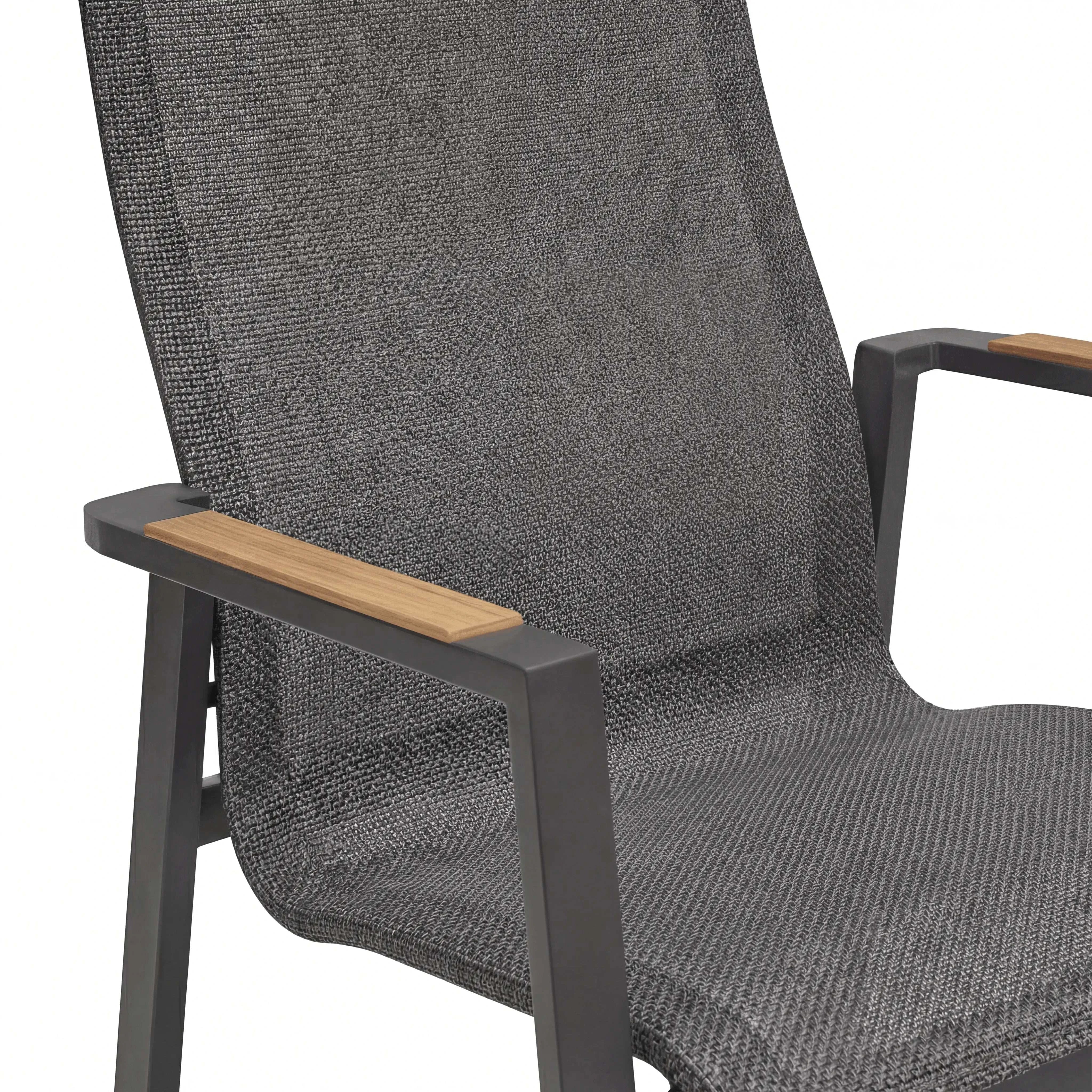 Das stabile Aluminiumgestell in Anthrazit sorgt für eine langlebige und standfeste Konstruktion. Sitz- und Rückenfläche bestehen aus einer pflegeleichten Textilbespannung, die sich angenehm anfühlt und sich ideal für den Einsatz im Freien eignet. Armlehnen aus FSC-zertifiziertem Teakholz setzen einen natürlichen Akzent und unterstreichen den hochwertigen Charakter dieses Gartenstuhls. Mit seinen ausgewogenen Proportionen ist der Hochlehner bestens für gemütliche Stunden unter freiem Himmel geeignet.
