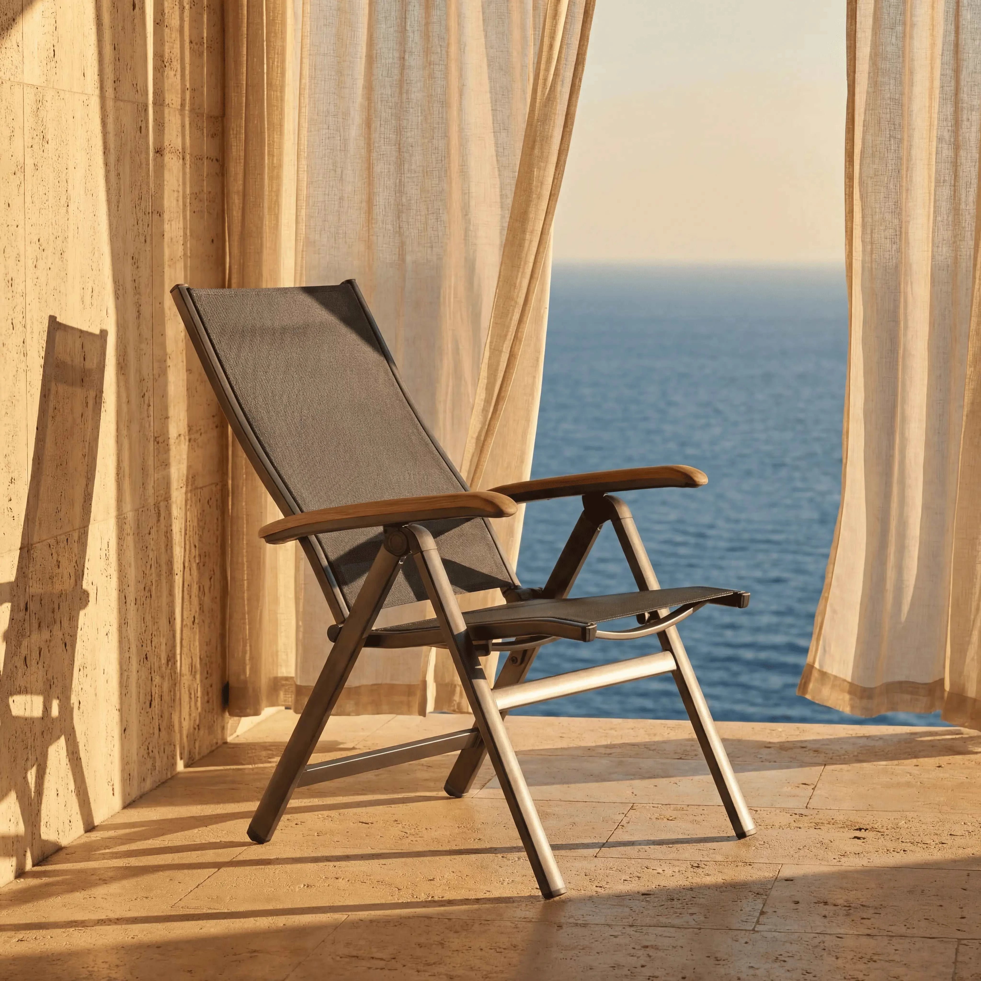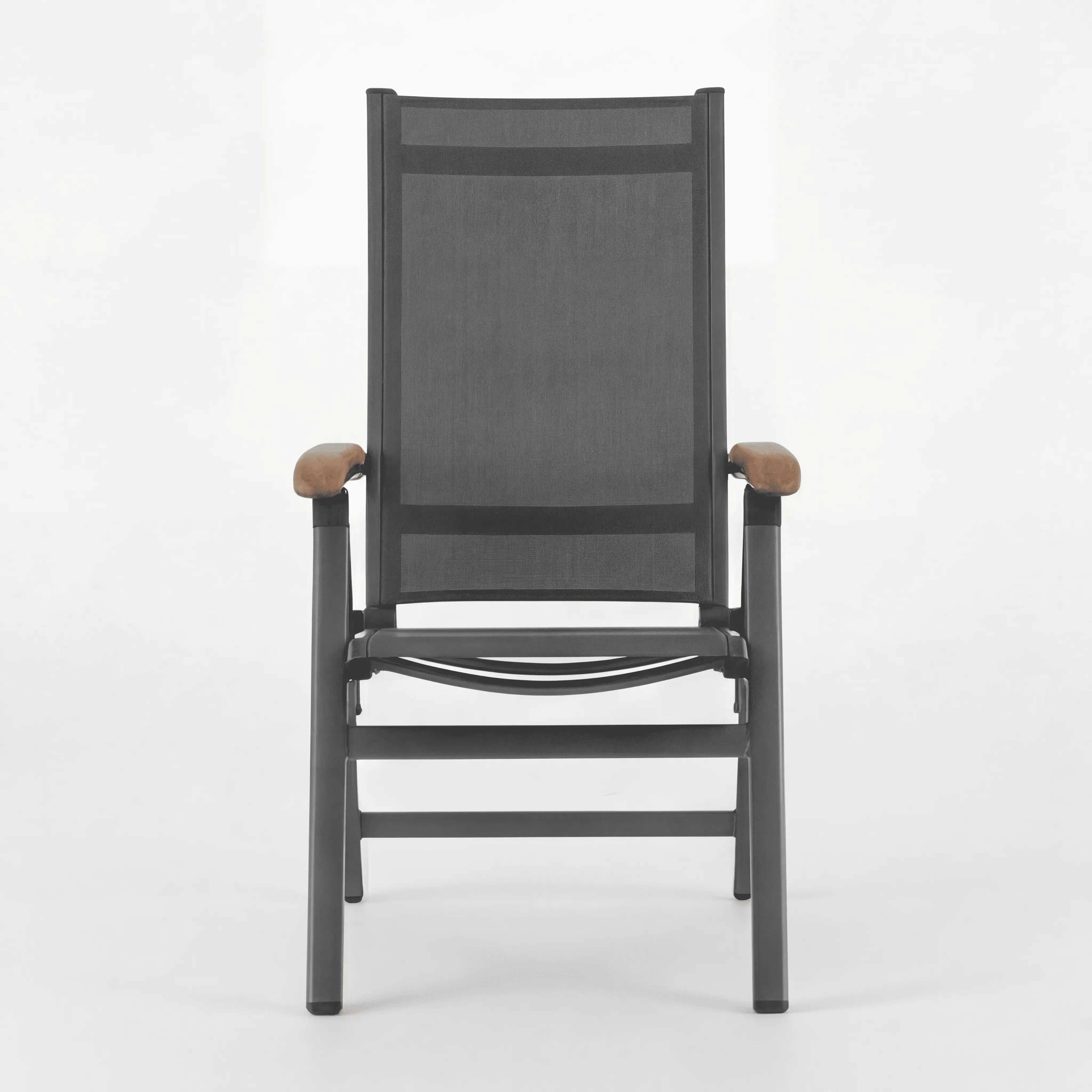 Der Multipositionsstuhl Reno kombiniert eine moderne Outdoor-Optik mit flexibler Nutzung. Das Aluminiumgestell in Eisengrau sorgt für eine klare Linienführung, während die Textilene-Bespannung in Anthrazit den Sitzbereich optisch zurückhaltend und outdoor-tauglich macht. Abgerundet wird das Design durch Armlehnen aus Teakholz (Natur), die einen warmen, natürlichen Akzent setzen.