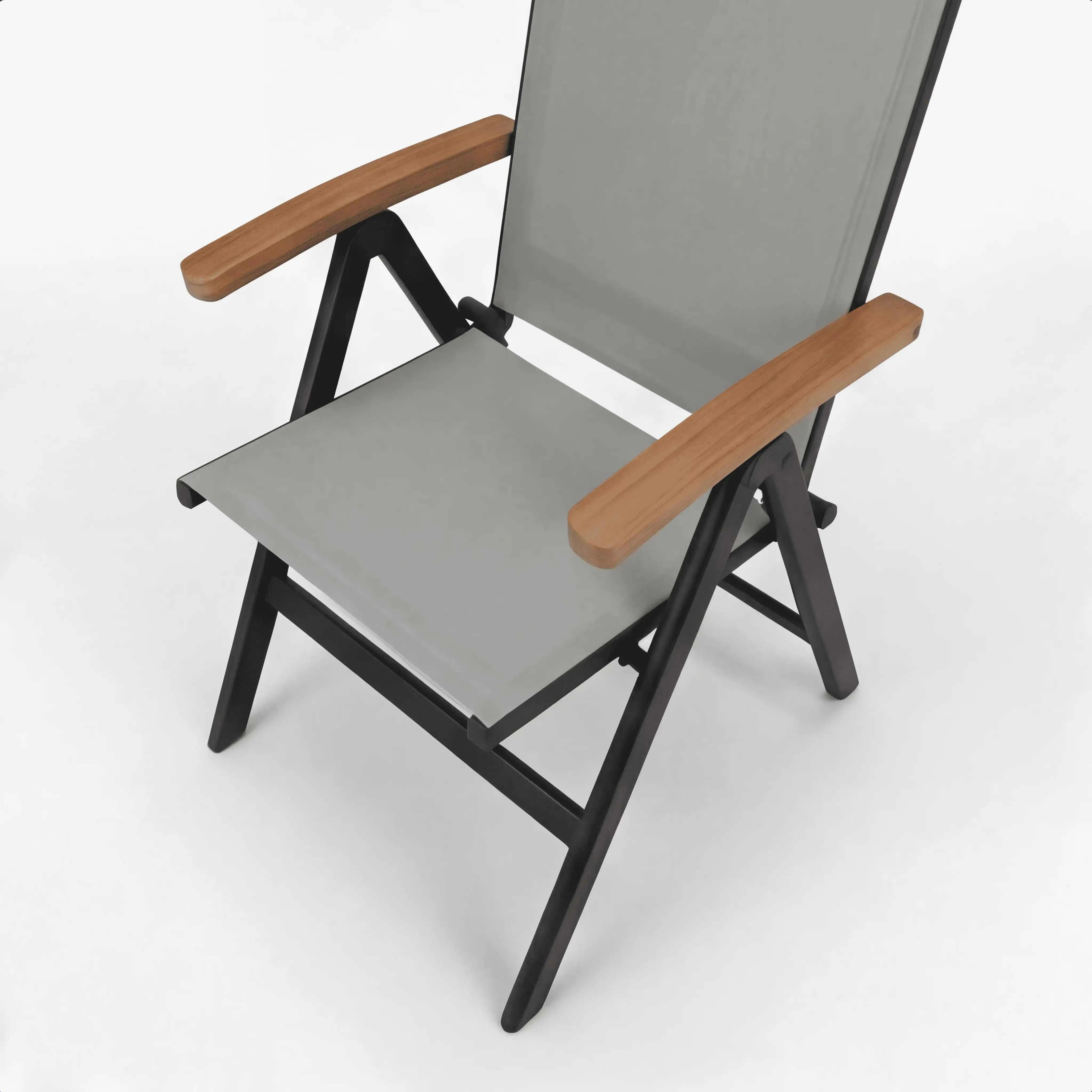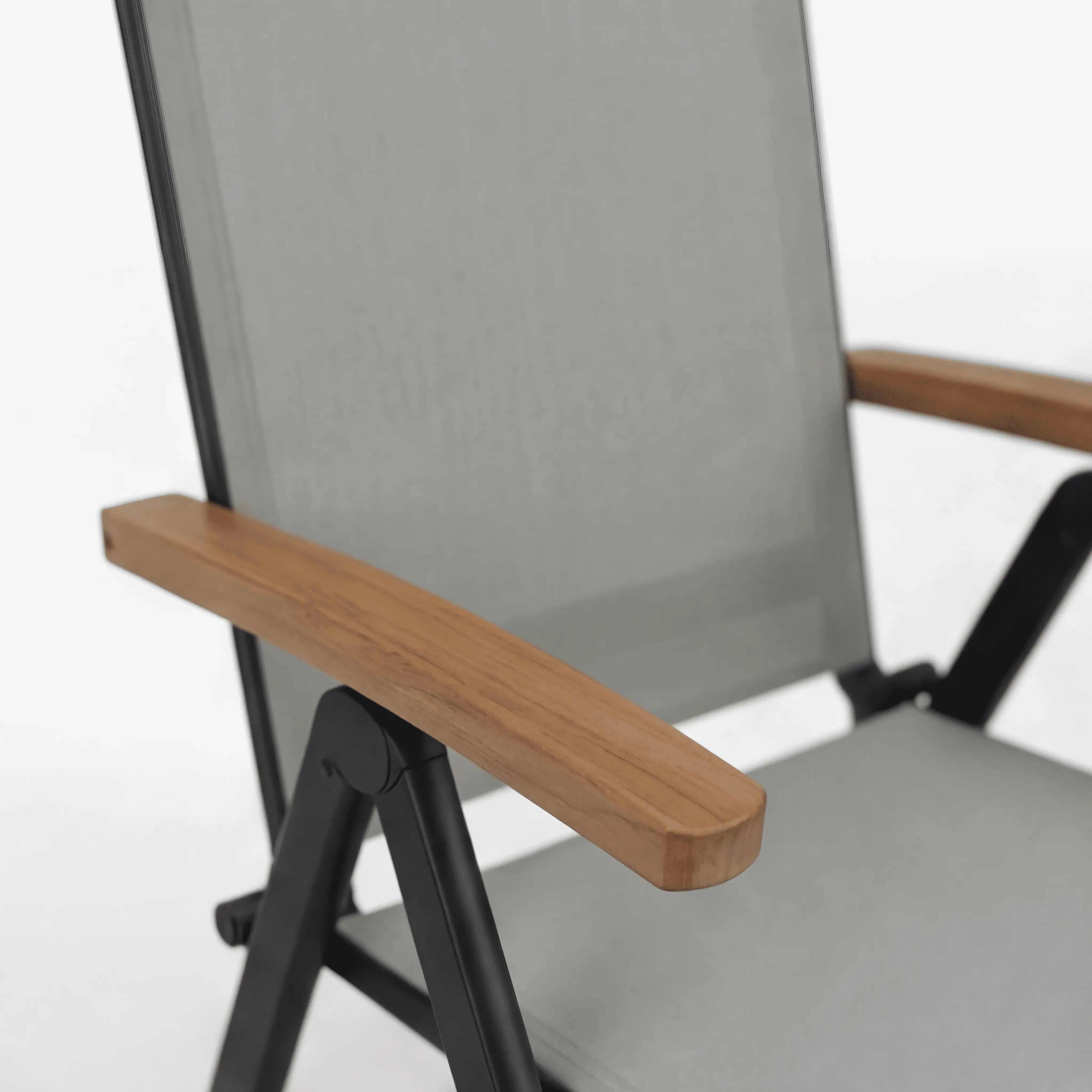 Der Calanda Position Stuhl verbindet eine klare, moderne Formsprache mit hohem Sitzkomfort. Das Aluminiumgestell in Charcoal wirkt leicht und stabil zugleich und macht den Stuhl zu einer starken Wahl für Terrasse, Garten oder Balkon. Durch die Armlehnen aus Holz bekommt das Design zusätzlich eine warme, natürliche Note.