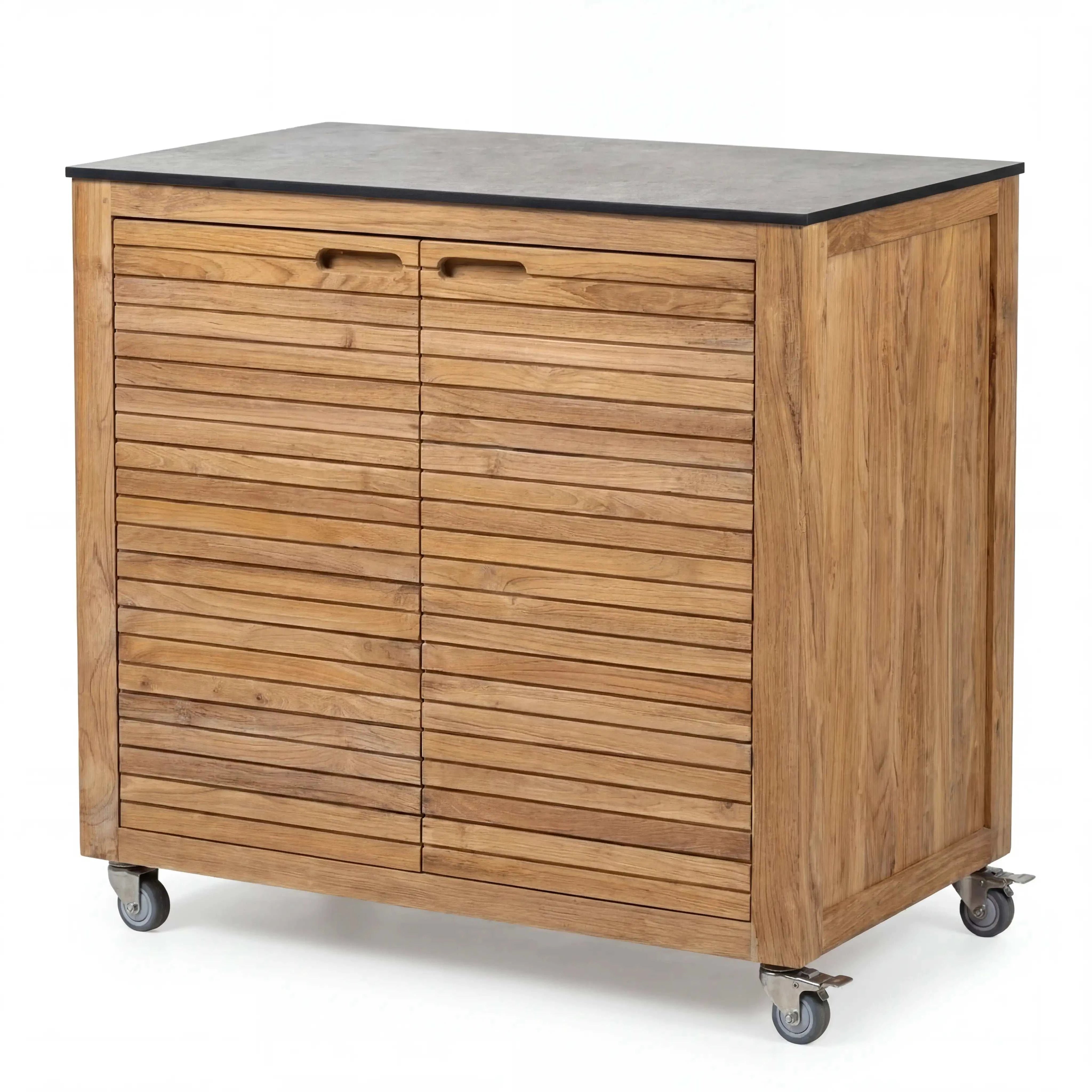 Mit 2 Türen bietet Elma Stauraum für Zubehör, Geschirr oder Outdoor-Tools. Durch die Lenkrollen ist das Sideboard rollbar und lässt sich bequem umpositionieren – z. B. von der Outdoor-Küche zur Terrasse. Mit ca. 100 × 58 × 88 cm hat es ein kompaktes, aber sehr nutzbares Format und wirkt mit 57,6 kg stabil und wertig.