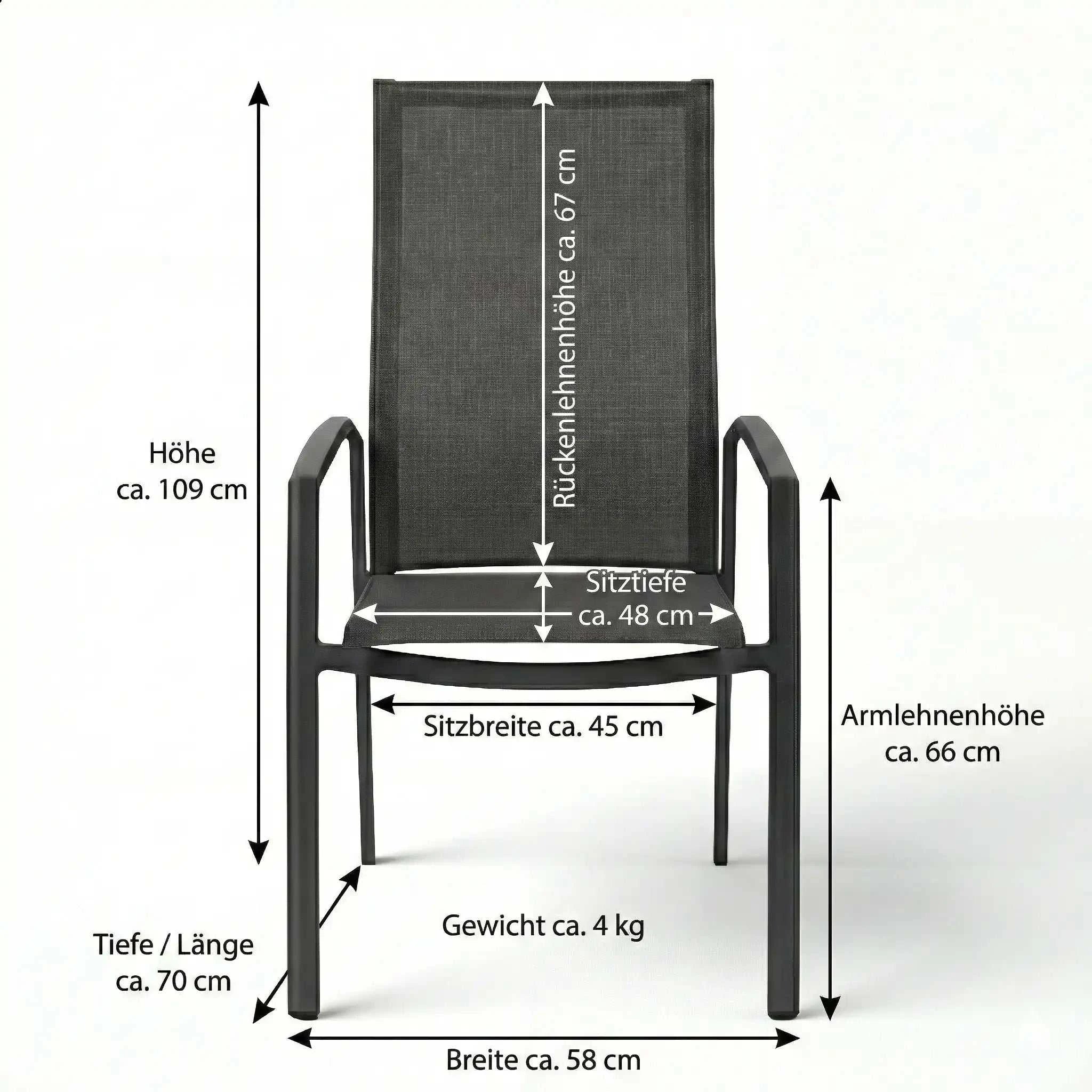 • Moderner Stapelsessel Kari mit hoher Rückenlehne und pulverbeschichtetem Aluminiumgestell in Anthrazit, Outdoor-Stuhl mit Textilen-Bezug in Karbon, leicht und stapelbar.