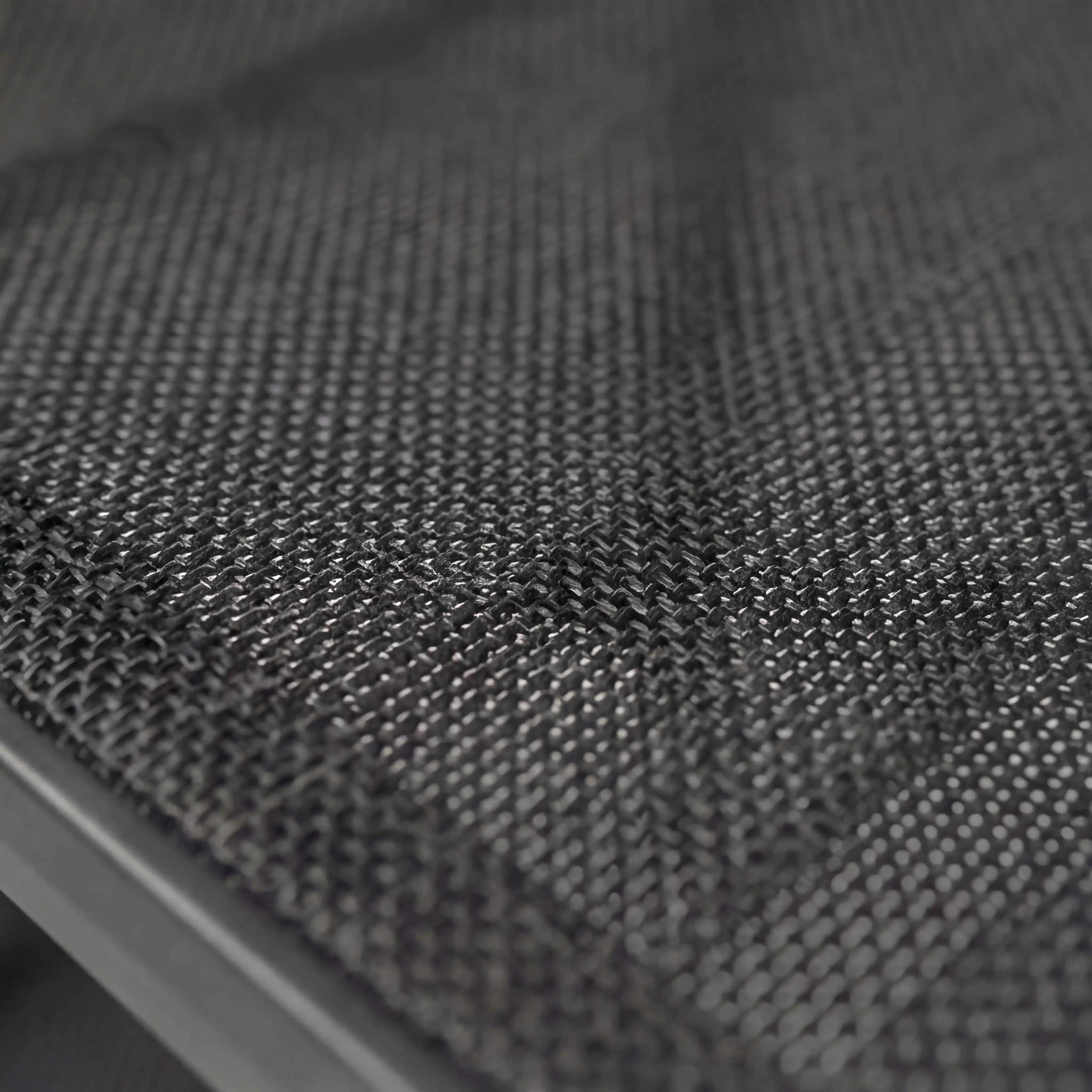 • Moderner Stapelsessel Kari mit hoher Rückenlehne, pulverbeschichtetem Aluminiumgestell und Textilen-Bezug in Karbon, ideal für Outdoor-Bereiche.