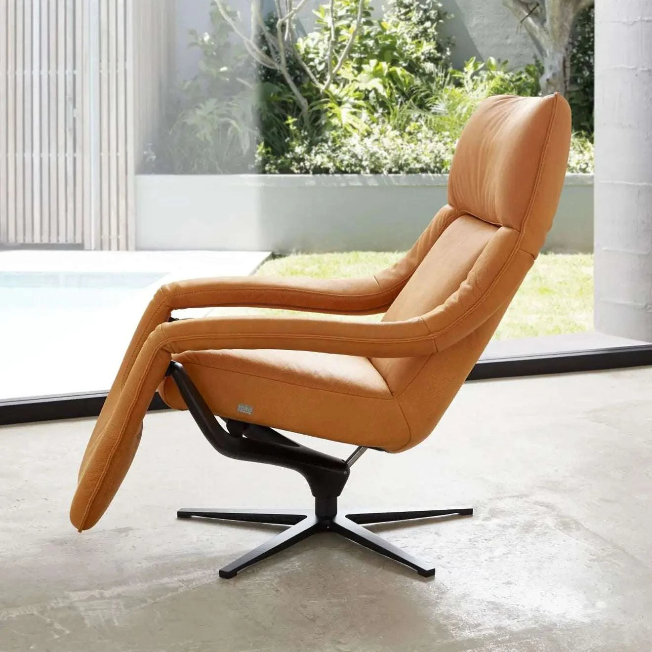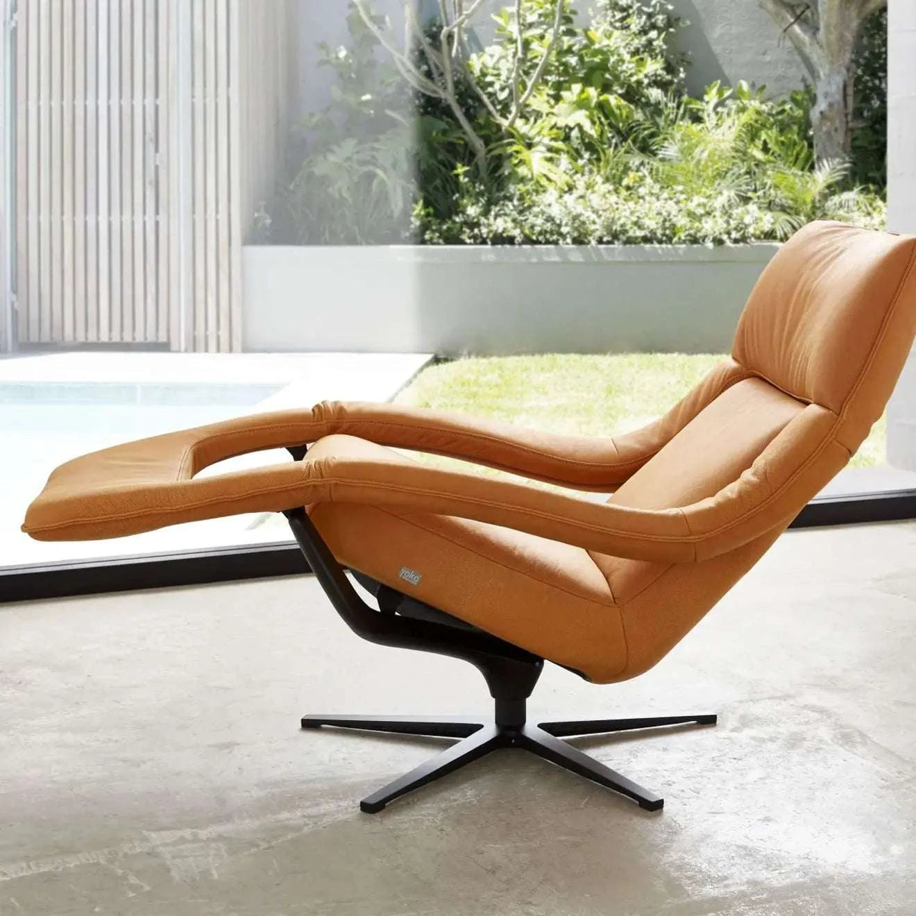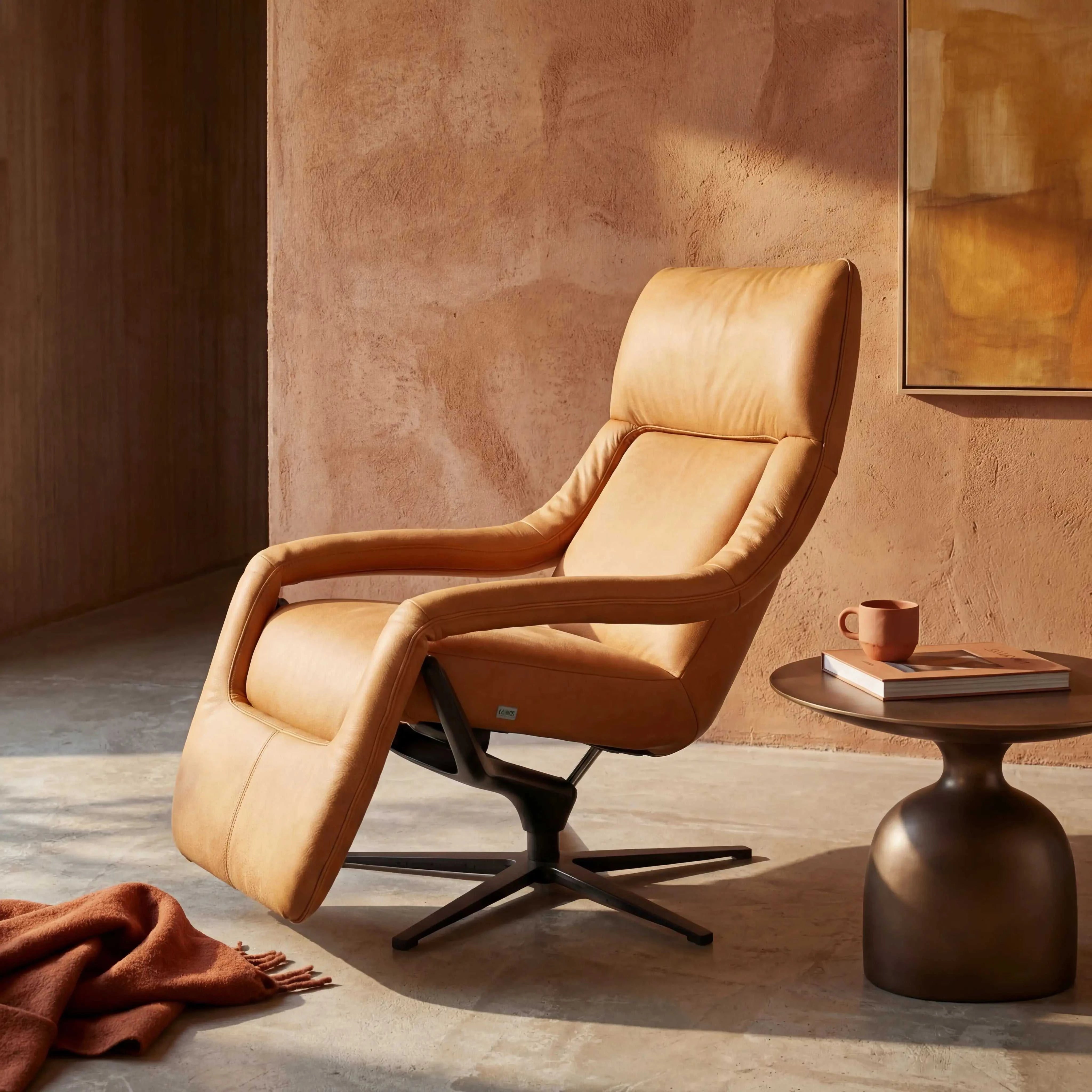 Das Highlight dieser Variante: Die motorische Relaxfunktion mit Netzstrom. Per Knopfdruck fährt die Fußstütze aus und die Rückenlehne neigt sich — stufenlos in jede gewünschte Position, ohne eigenen Kraftaufwand. Das 5-Arm-Metalldrehkreuz inkl. Alugabel in pulverbeschichteter Struktur braun/bronziert verleiht dem Yoko einen warmen, wertigen Standfuß.