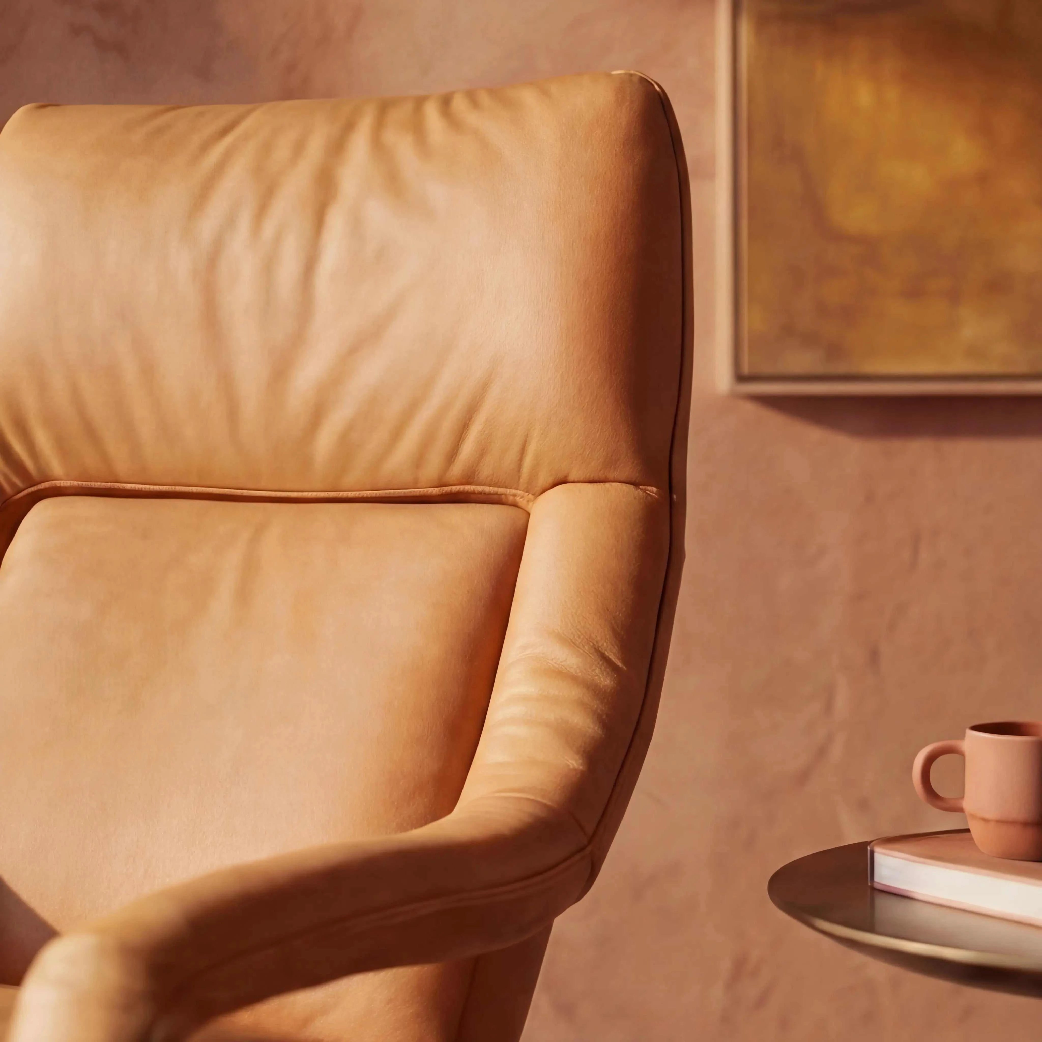 Der Fernsehsessel Yoko von Koinor in dieser Ausführung vereint zwei Materialien: Sitz und Rücken sind in Kissenstoff 73 bezogen — weich, anschmiegsam und warm. Rahmen, Kopfteil, Armteile und Fußstütze tragen den Bezug Oyster 34, der einen edlen Kontrast bildet.