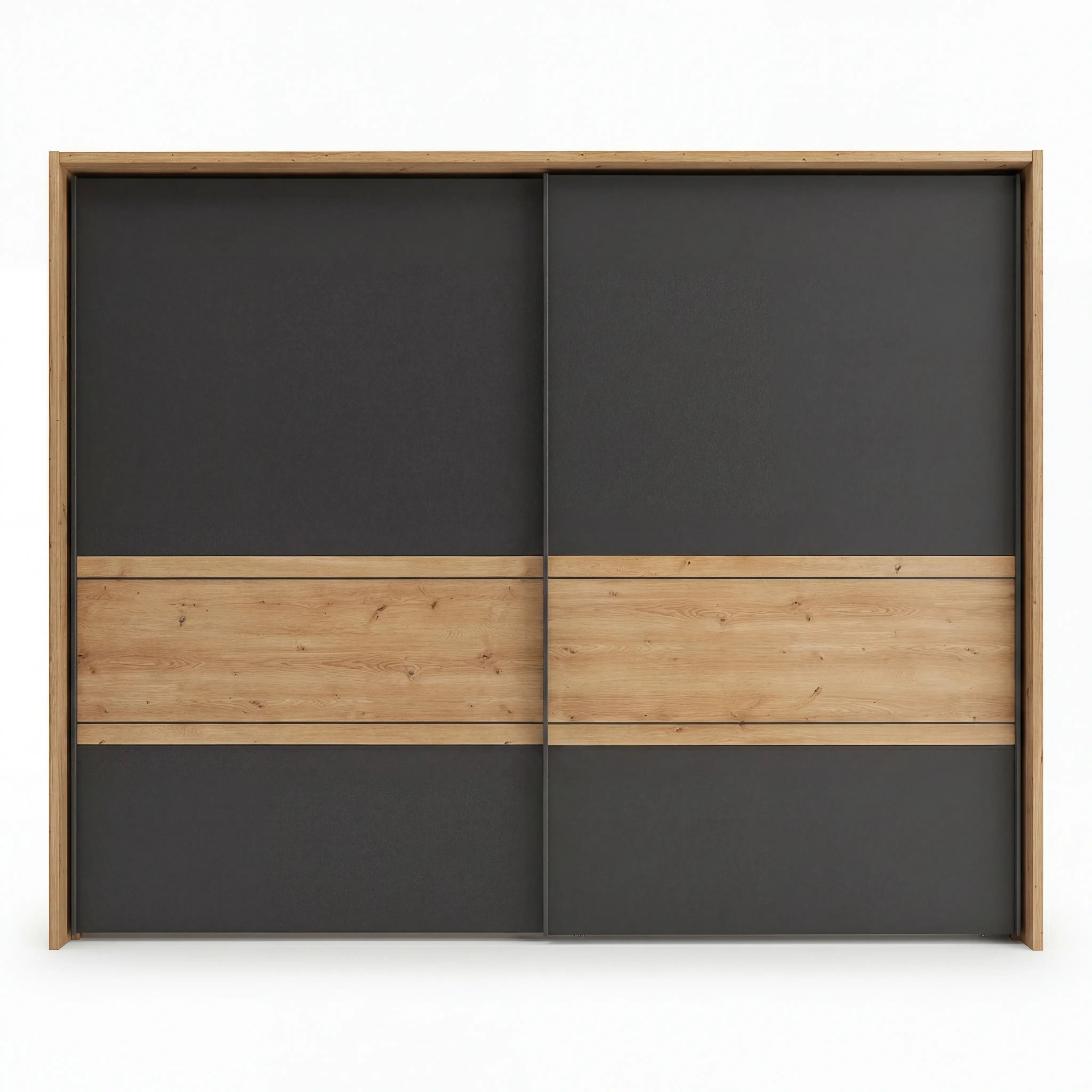 Schwebetürenschrankschrank, B/H/T ca. 300 x 217 x 67 cm Futon-Doppelbett, Holzkopfteil mit oberen Paneel und Fußteil im Absetz-Farbton und Kufe in Schiefer Liegefläche ca. 180 x 200 cm Nachtschrank, P