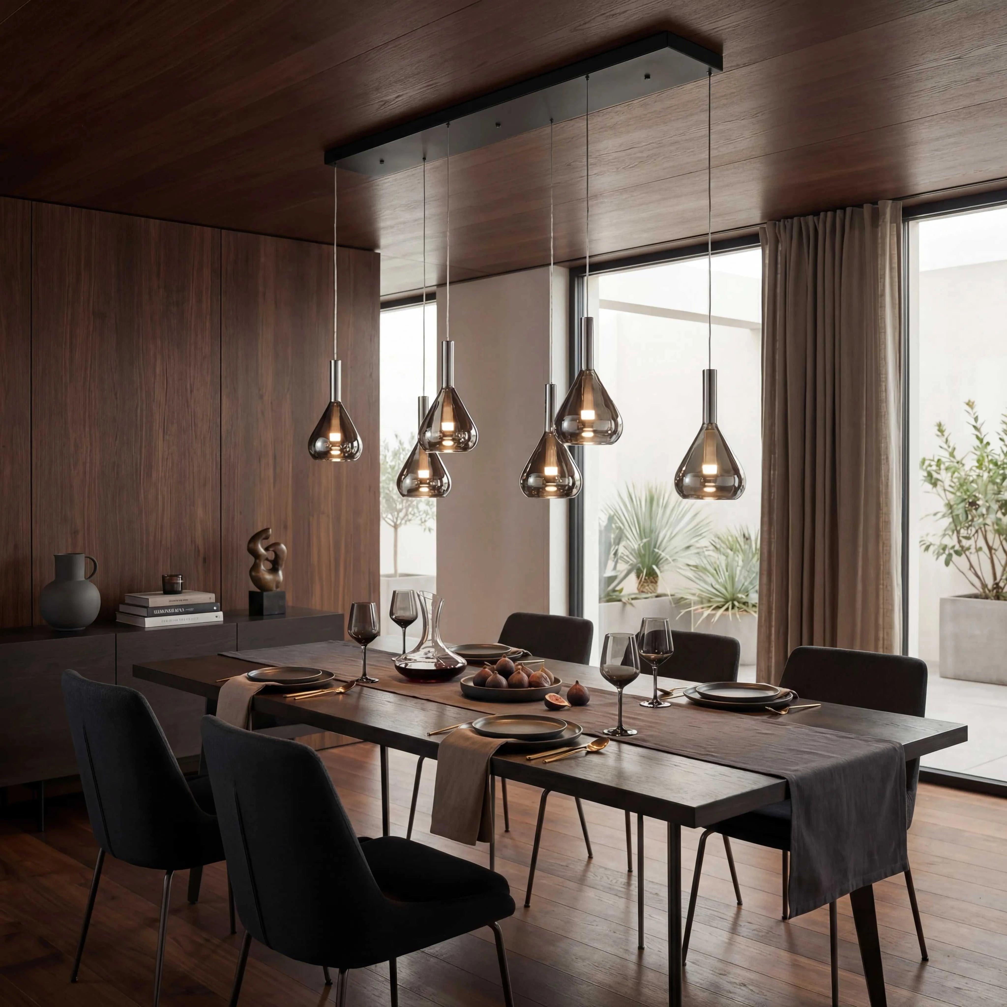 Die große Pendelleuchte von Trio Leuchten setzt über Esstischen und Kücheninseln ein architektonisches Zeichen. Mit einer Leuchtfläche von 155 x 40 cm und einer maximalen Abhängehöhe von 200 cm fügt sie sich flexibel in unterschiedliche Raumhöhen ein.
