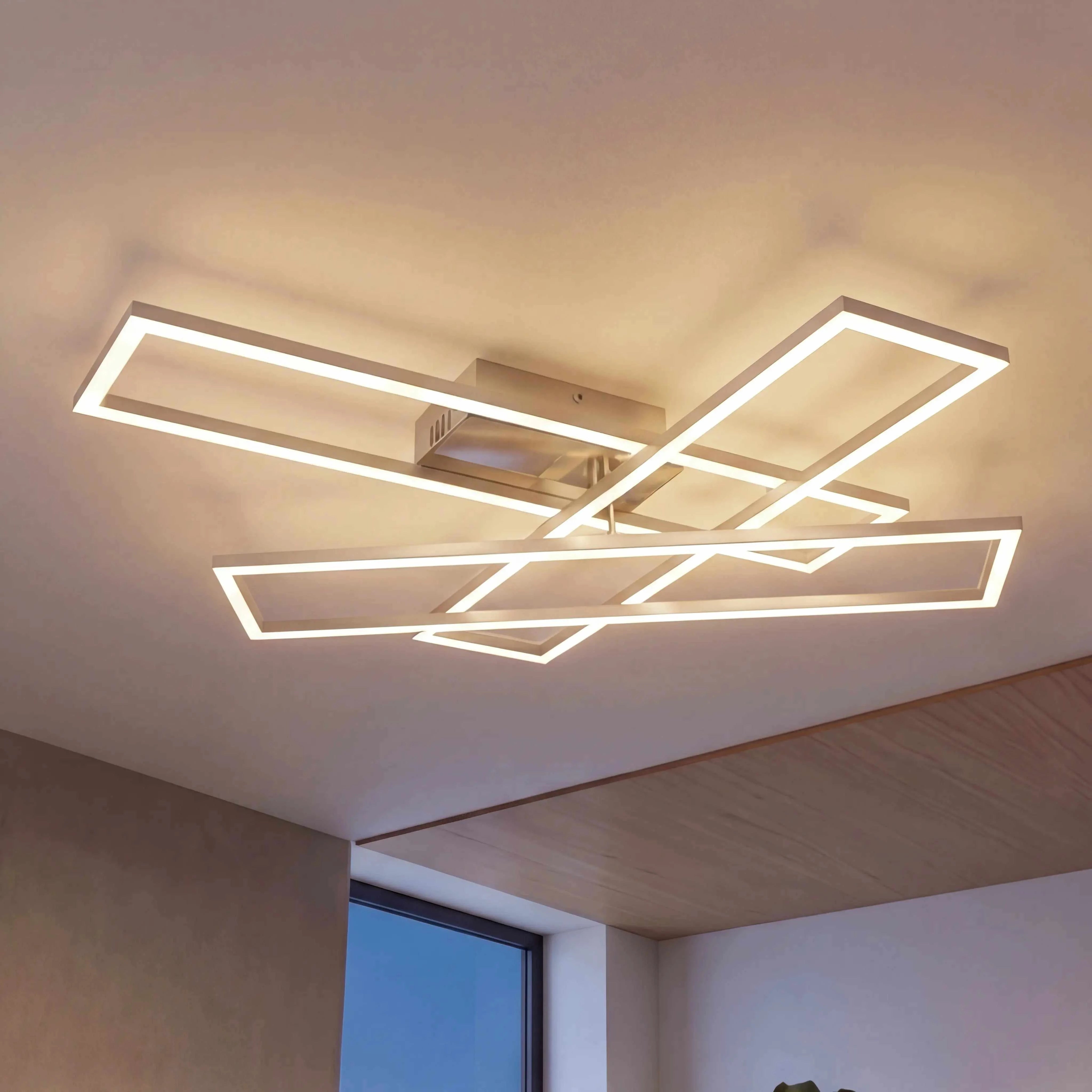 Die Decken- und Wandleuchte ist ein echtes Statement-Piece. Ihre puristischen, individuell schwenkbaren Lichtelemente machen sie zu einer wandlungsfähigen Lichtinstallation mit Wow-Effekt – perfekt für Wohnzimmer, Flur oder Esszimmer. Per Fernbedienung steuern Sie Helligkeit und Lichtfarbe stufenlos von Warmweiß (2700K) bis Tageslichtweiß (6000K).